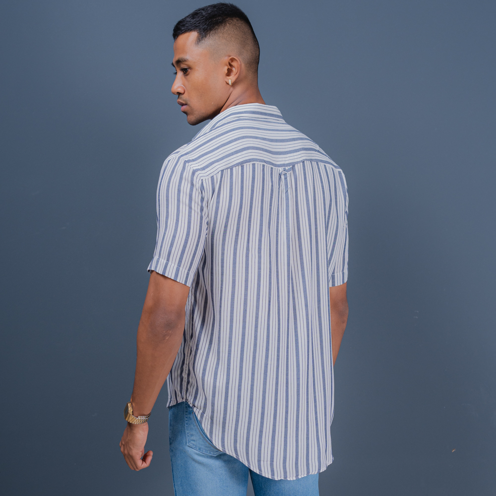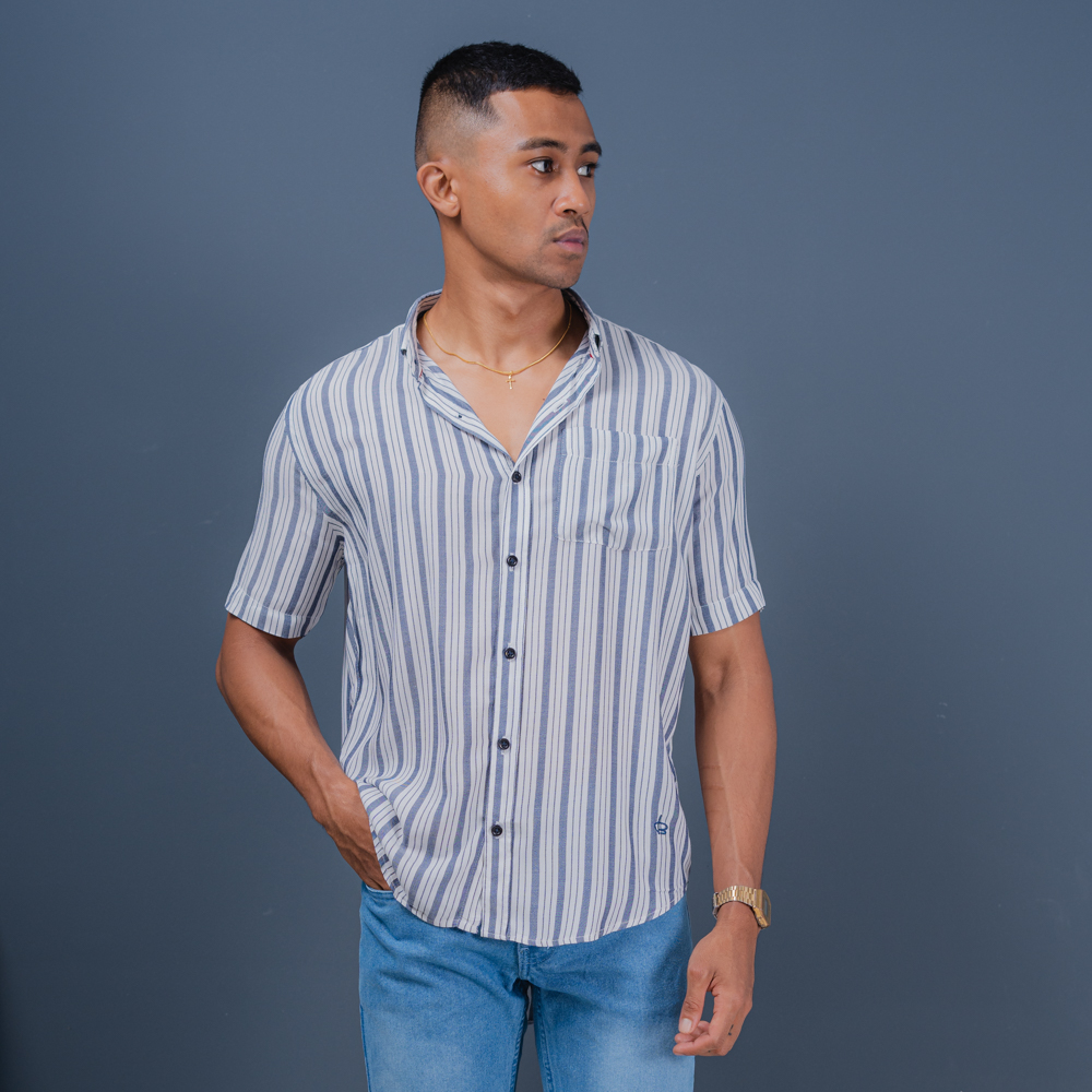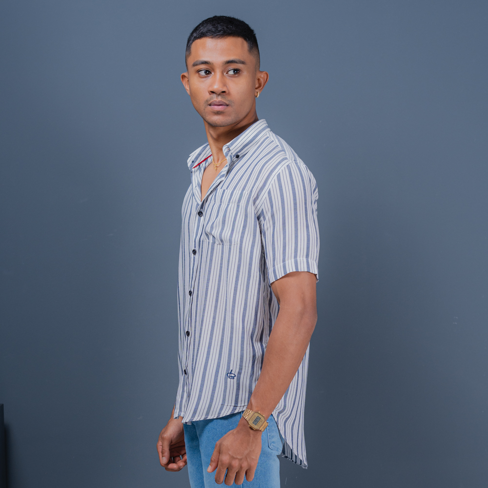 Description: Make a statement with our blue-grey striped short-sleeve shirt, designed for the fashion-forward individual. Crafted from high-quality materials and featuring a sleek striped pattern in shades of blue & grey, this eye-catching piece exudes sophistication and style. Whether you’re heading to a rooftop party or exploring the city streets, our shirt ensures you look effortlessly cool and put-together.